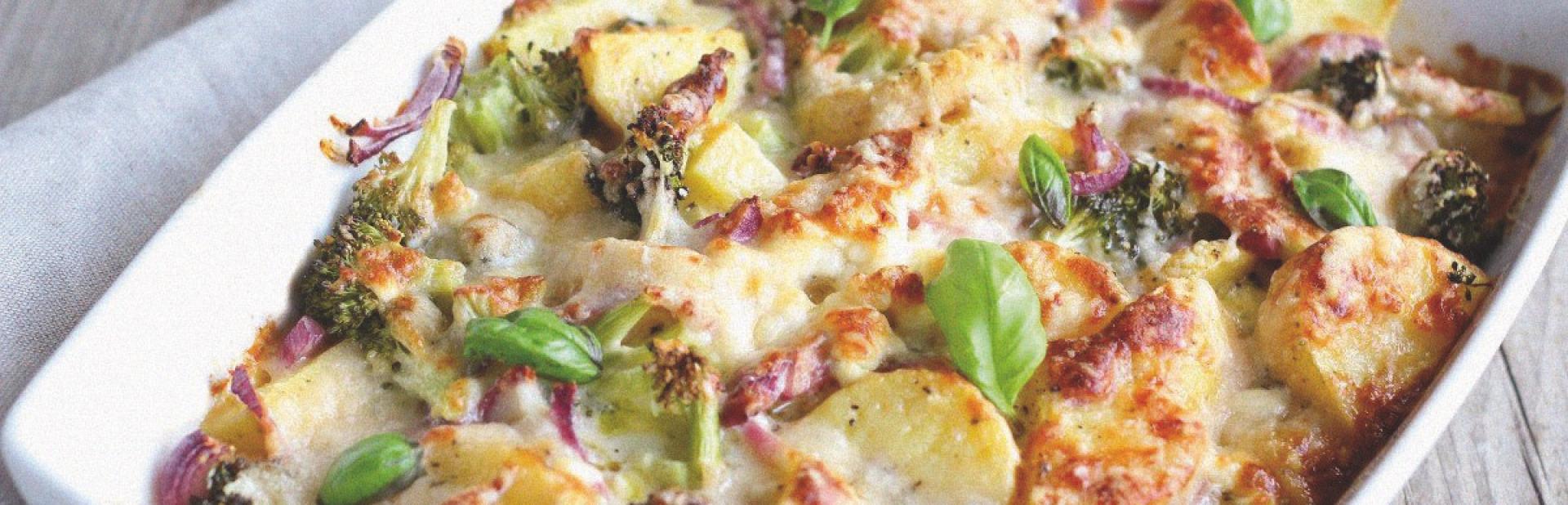 Das Gemüse abwechselnd mit Fleisch in die Auflaufform schichten und mit Béchamelsauce übergießen.